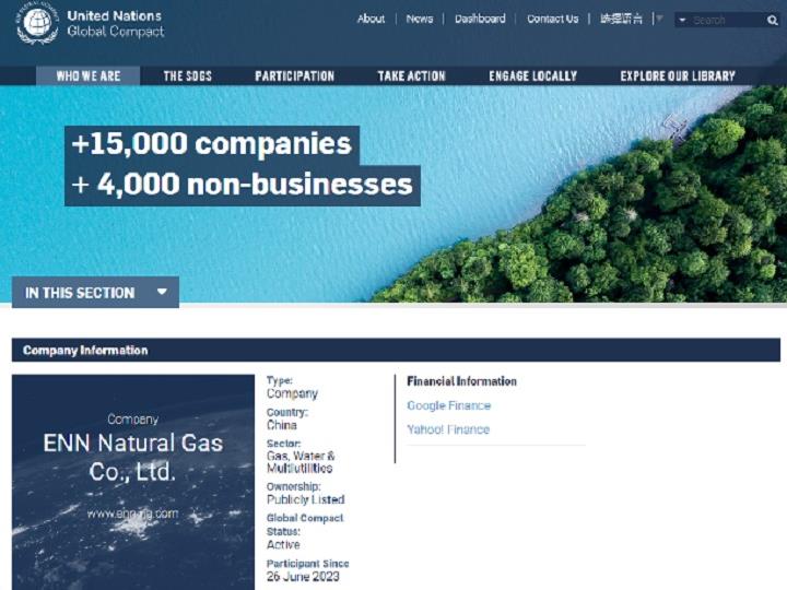 -     							2023-07-10    							新奥股份正式加入联合国全球契约组织新奥股份近日成功通过联合国审核,正式成为A股燃气行业首家加入联合国全球契约组织(UN Global Compact)的企业。加入联合国全球契约组织,是新奥股份积极践行可持续发展战略的行动之一,彰显中国燃气企业积极贯彻可持续发展的决心,为建设美丽中国和全球可持续发展做出更大的贡献。