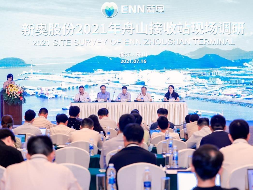-     							2021-07-19    							新奥股份举行2021舟山接收站现场调研活动7月16日,新奥股份举行2021年新奥舟山LNG接收站现场调研活动,来自内地及香港投资人、分析师及研究员踊跃参加,其中60余位齐聚舟山,有100余位通过直播或电话参加,与新奥股份管理层深入交流,并现场参观了蓝焰项目、新奥舟山LNG接收站及新奥智能物流园区,详细了解新奥股份产业一体化布局以及智能化、生态化升级新进展,共同探讨天然气产业发展新思路。